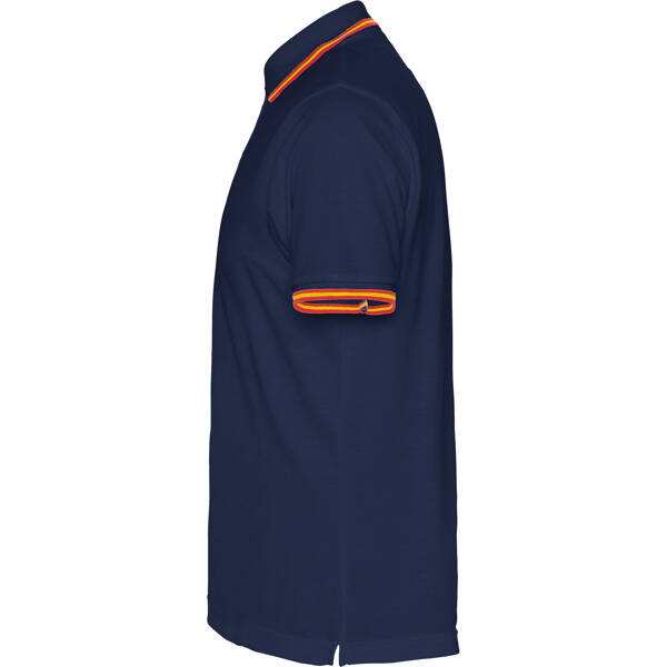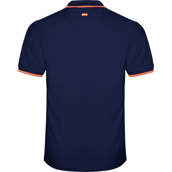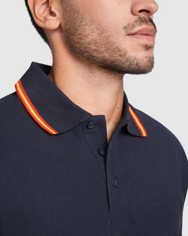 Polo manica corta a tre bottoni, colleto e polsini in jaquard. Cuciture ricoperte di rinforzo nel colletto. Abbellimento della bandiera ricamato sul retro.