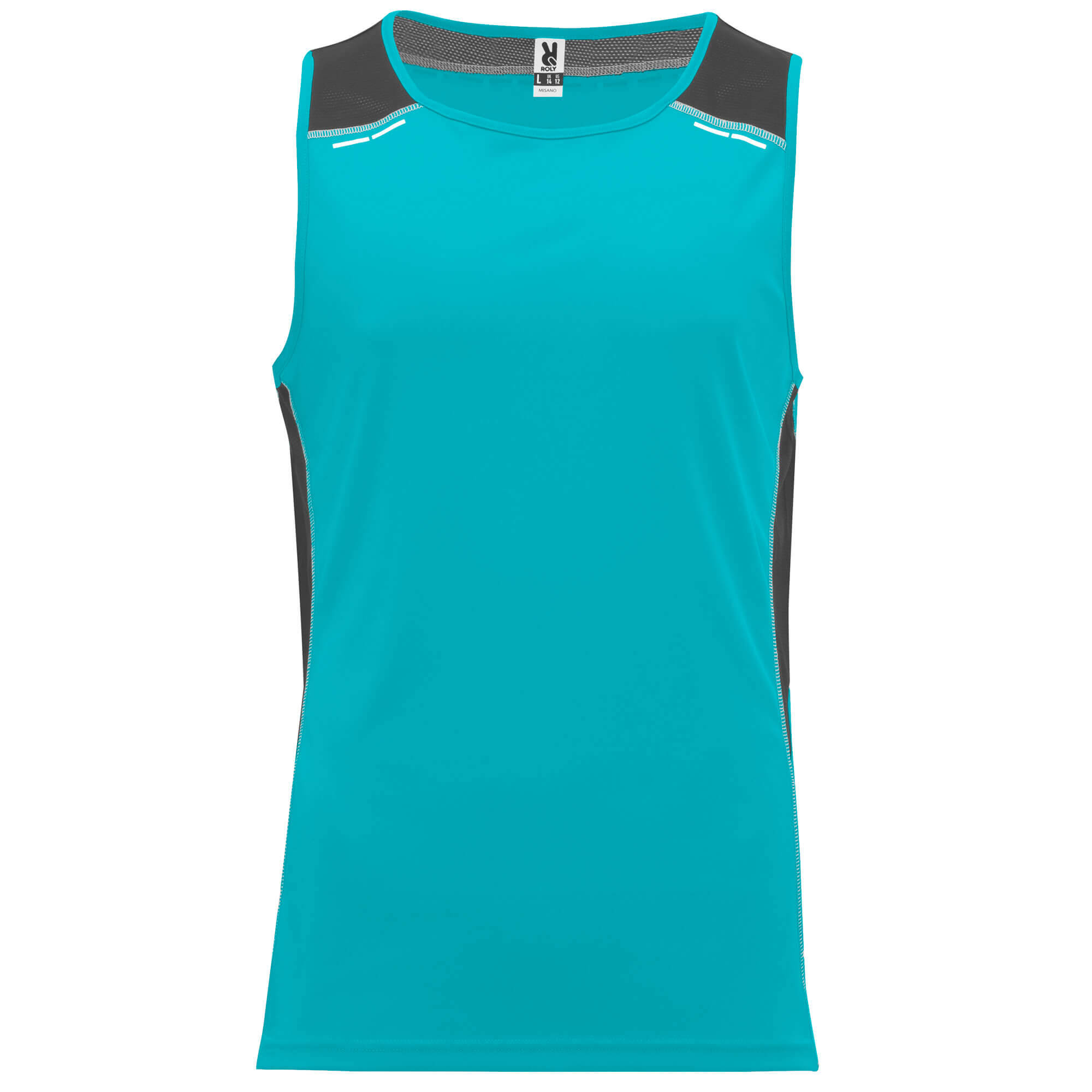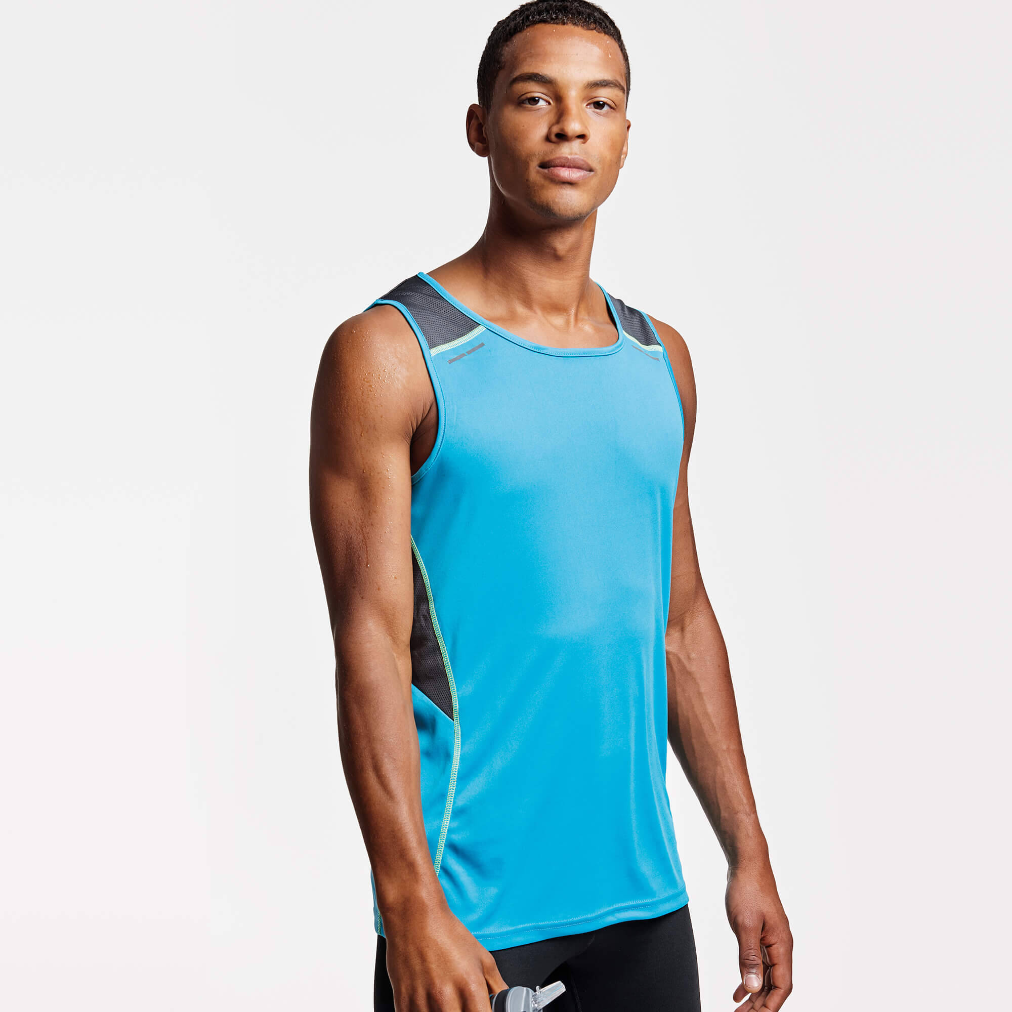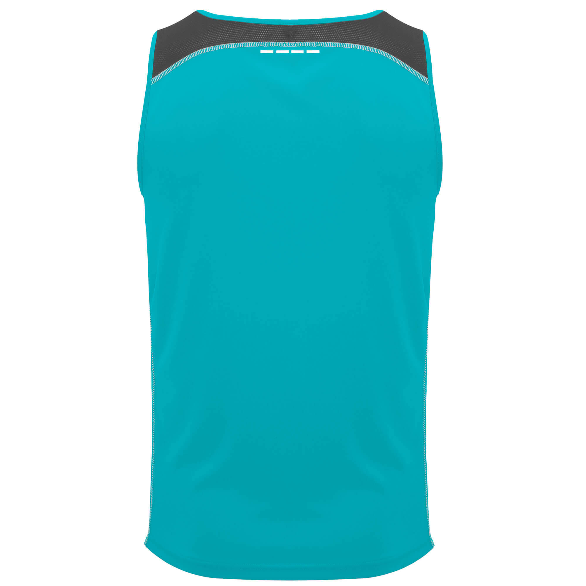 Canottiera con dettagli riflettenti. Girocollo con copricuciture di rinforzo. Formata da due tessuti combinati di poliestere e tre colori. Tessuto principale interlock, pannelli laterali e superiore in tessuto microforato per una maggiore traspirazione. Facile asciugatura.