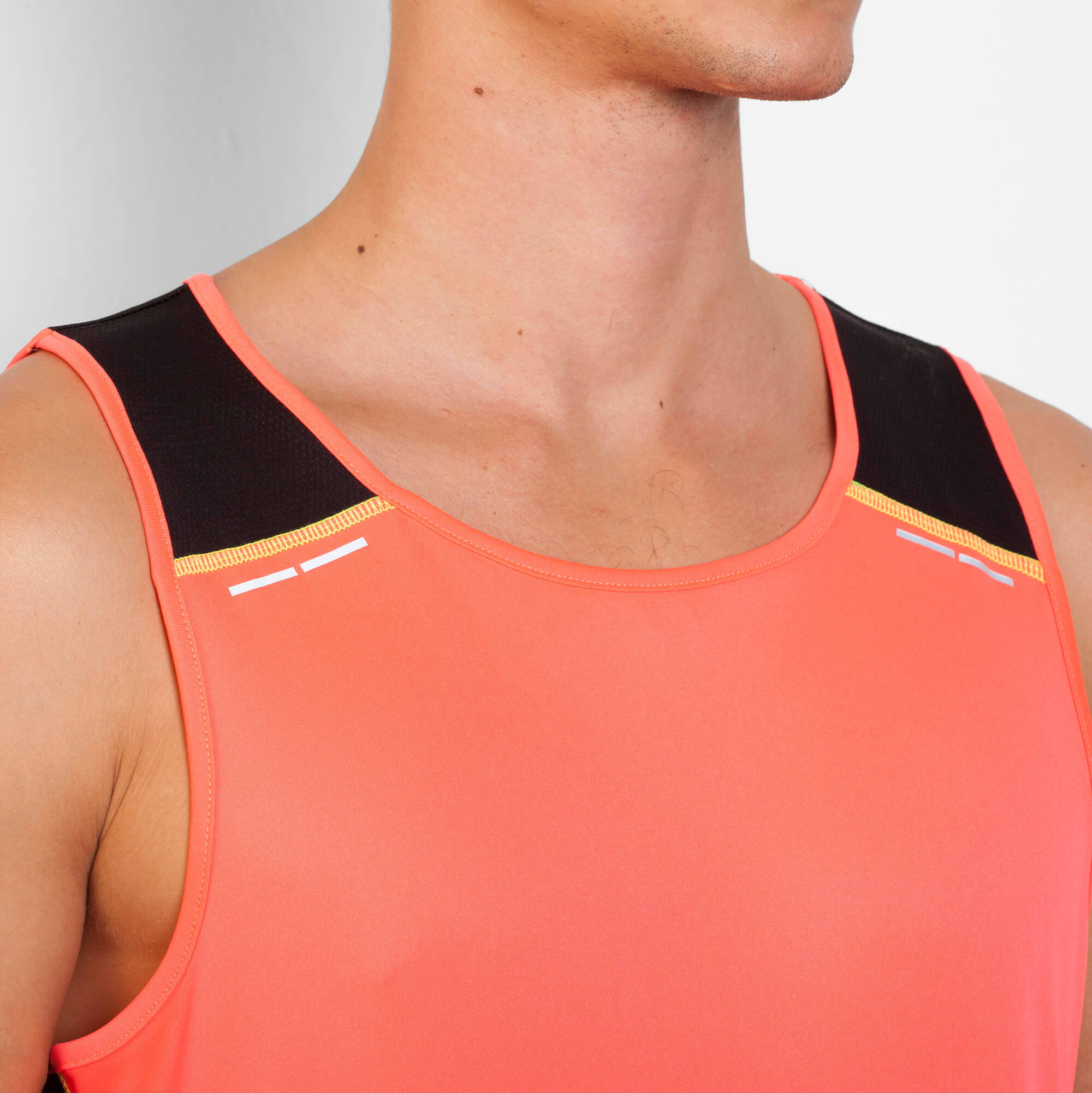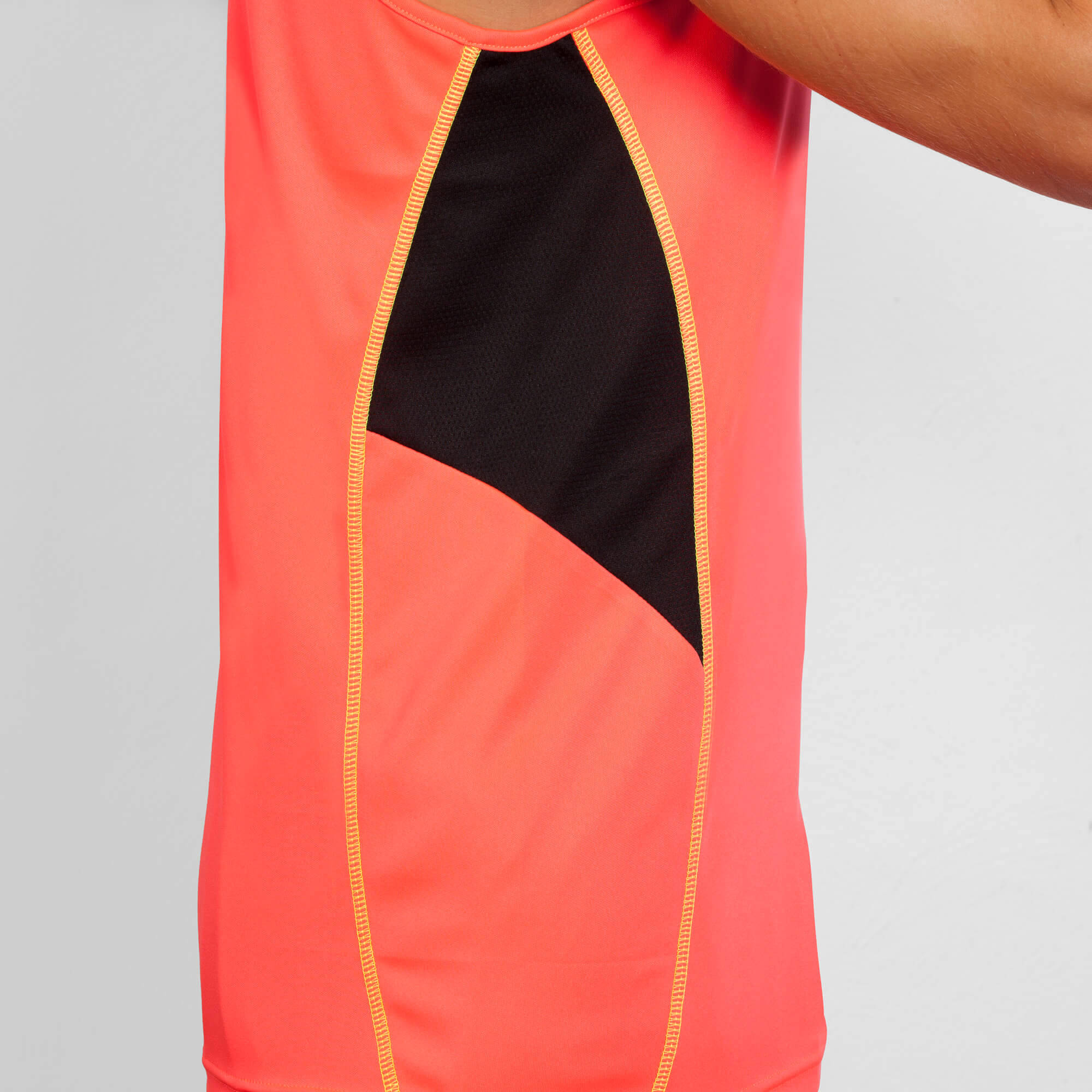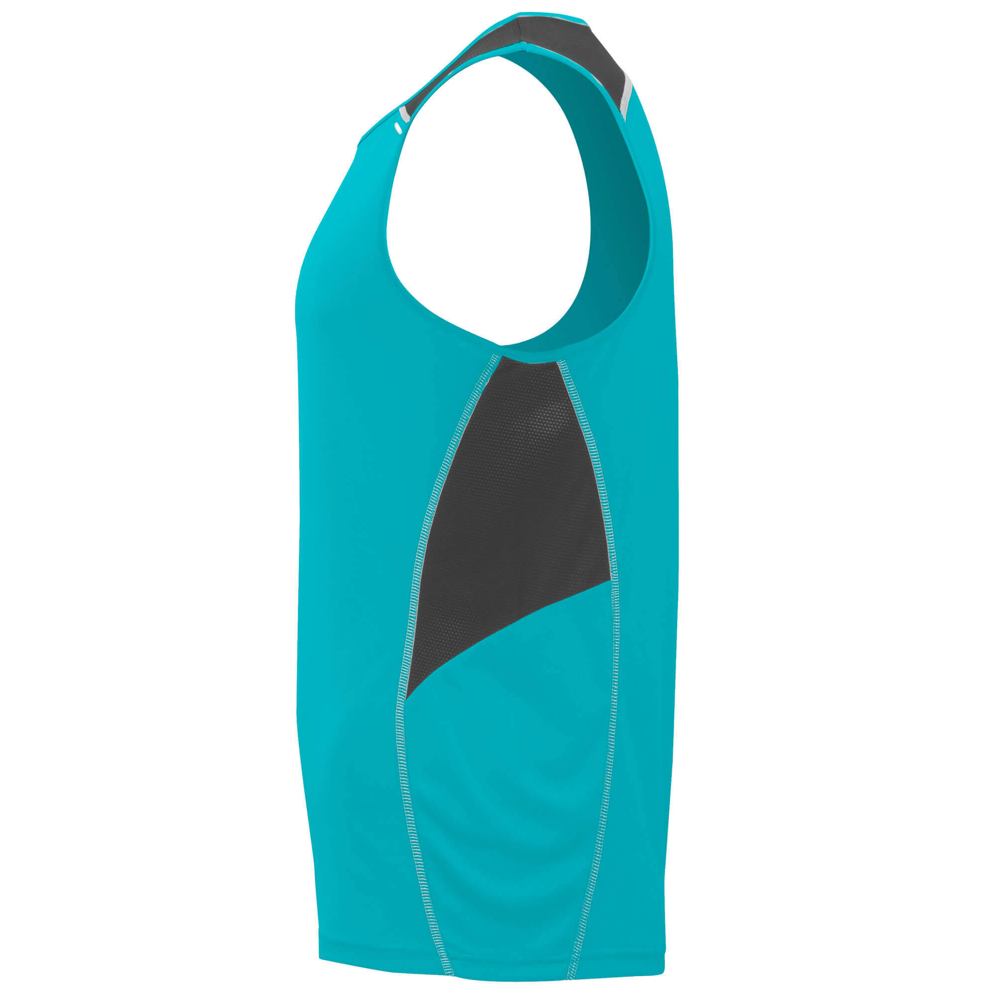 Canottiera con dettagli riflettenti. Girocollo con copricuciture di rinforzo. Formata da due tessuti combinati di poliestere e tre colori. Tessuto principale interlock, pannelli laterali e superiore in tessuto microforato per una maggiore traspirazione. Facile asciugatura.
