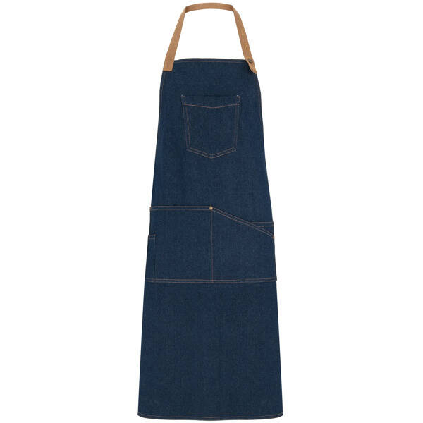 Grembiule lungo in tessuto jeansato: 1. Nastro del collo in contrasto e regolabile in tre posizione mediante bottoni metallici. 2. Una tasca nel petto 3. Quattro tasche frontali con rivetti, uno dei quali specifico per penne. 4. Nastri laterali in contrasto per allacciarlo.