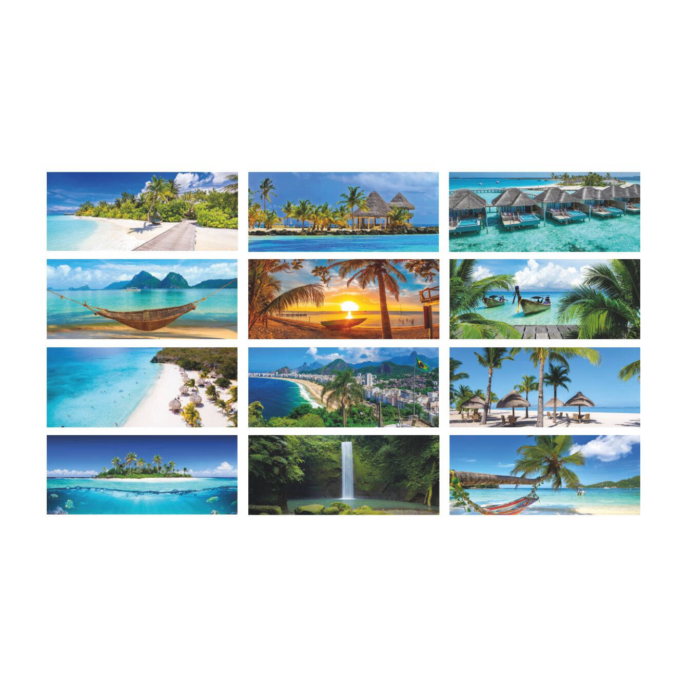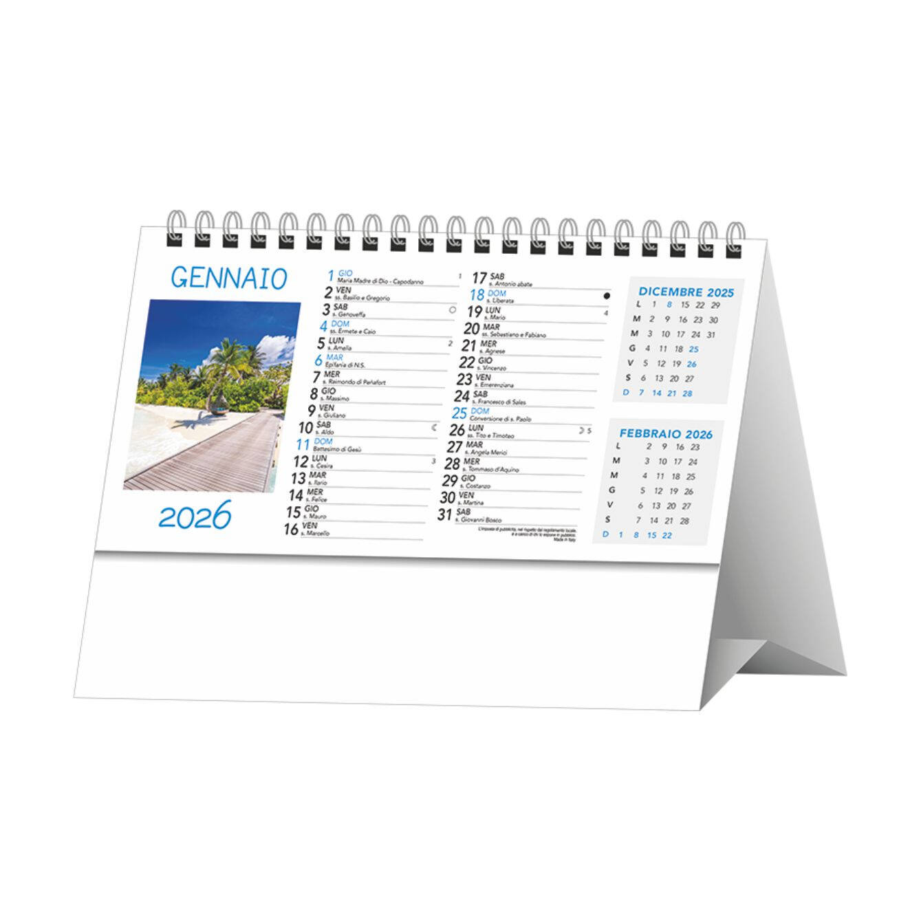 Tropical Calendario da tavolo. Carta patinata opaca 100gr, trimestrale 12 fogli. Piedino cm 19x3,5. Dimensione: cm 19x14,5. Imballo: 100pz. Carta Patinata . Gr. 90 mq
